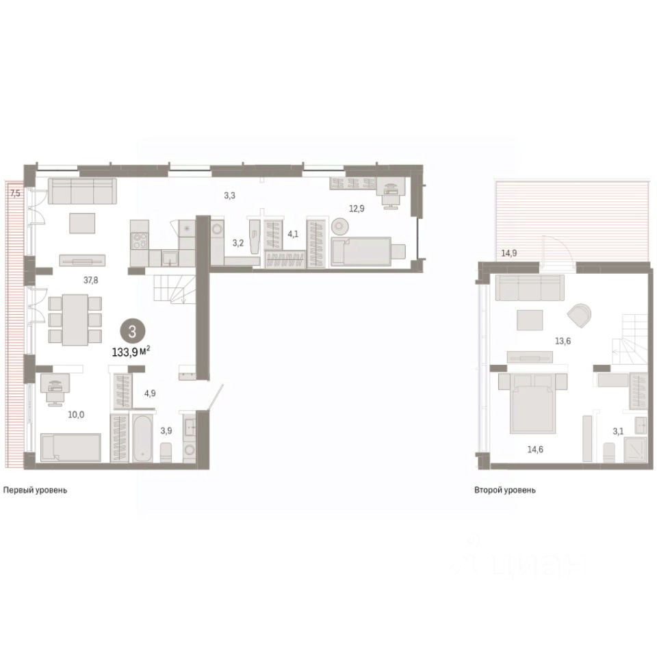 Продается трехкомнатная квартира с предчистовой отделкой в ЖК "Республики 205" на 7 этаже. Общая площадь: 133.89 кв.м. Высота потолков 2.7 м.