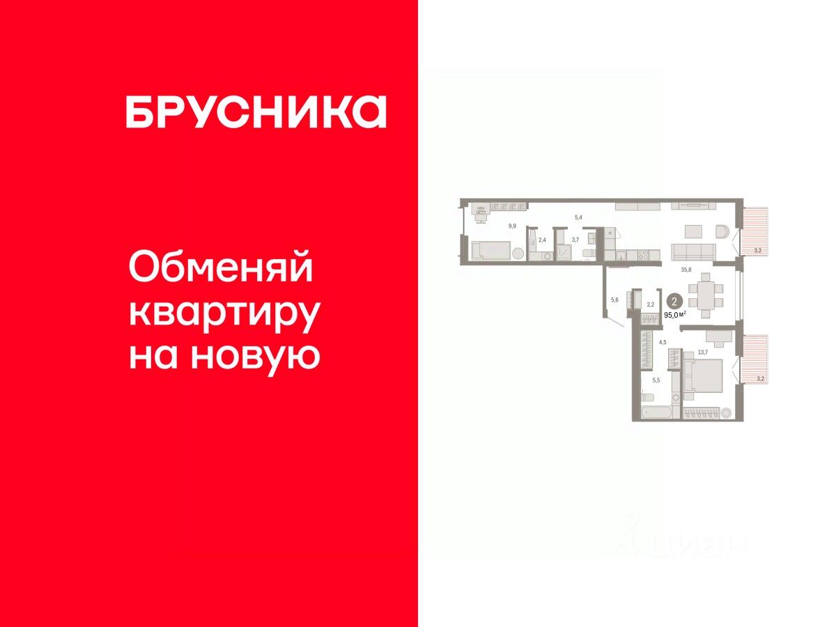 Просторная двухкомнатная квартира с предчистовой отделкой в ЖК "Республики 205" на 4 этаже. Общая площадь: 94.99 кв.м., жилая: 23.6 кв.м., площадь просторной кухни-гостиной: 35.8 кв.м. Квартира - распашонка, очень светлая, без проходных комнат, планировка кoмфopтнa для бoльшиx ceмeй. В квартире два балкона, два совмещенных санузла. Высота потолков 2.7 м.