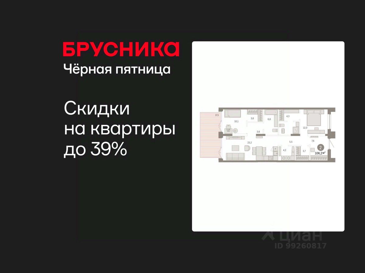 2-комн. квартира с предчистовой отделкой в ЖК "Республики 205" на 1 этаже. Общая площадь: 106.21 кв.м. Высота потолков 2.7 м.