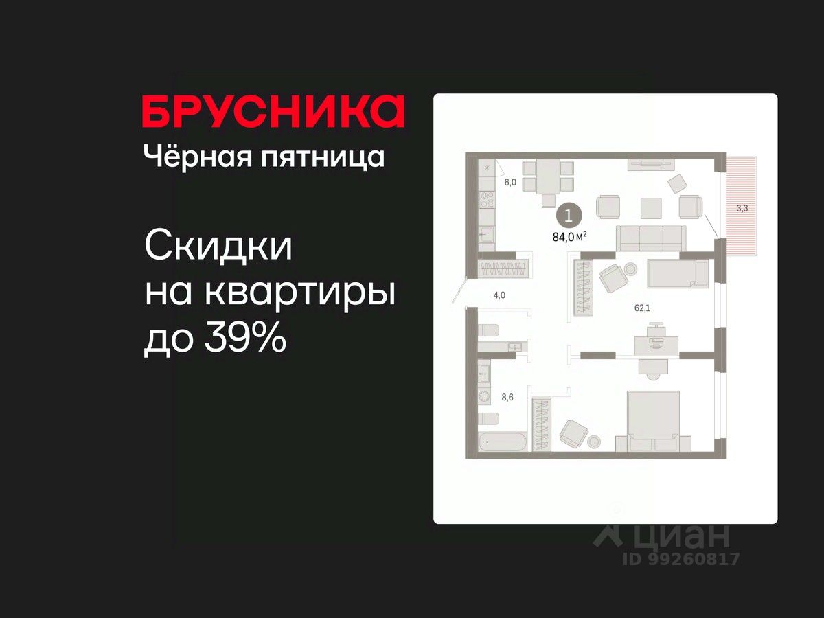 1-комн. квартира с предчистовой отделкой в ЖК "Республики 205" на 2 этаже. Общая площадь: 84.02 кв.м., жилая: 40 кв.м., площадь просторной кухни-гостиной: 10 кв.м. Все окна выходят на одну сторону. В квартире один балкон, один совмещенный санузел. Высота потолков 2.6 м.