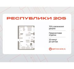 1-комн. квартира с предчистовой отделкой в ЖК "Республики 205" на 7 этаже. Общая площадь: 64.3 кв.м., жилая: 45.7 кв.м., площадь кухни: 6.1 кв.м. Все окна выходят на одну сторону. В квартире один совмещенный и один раздельный санузел. Высота потолков 2.6 м.
