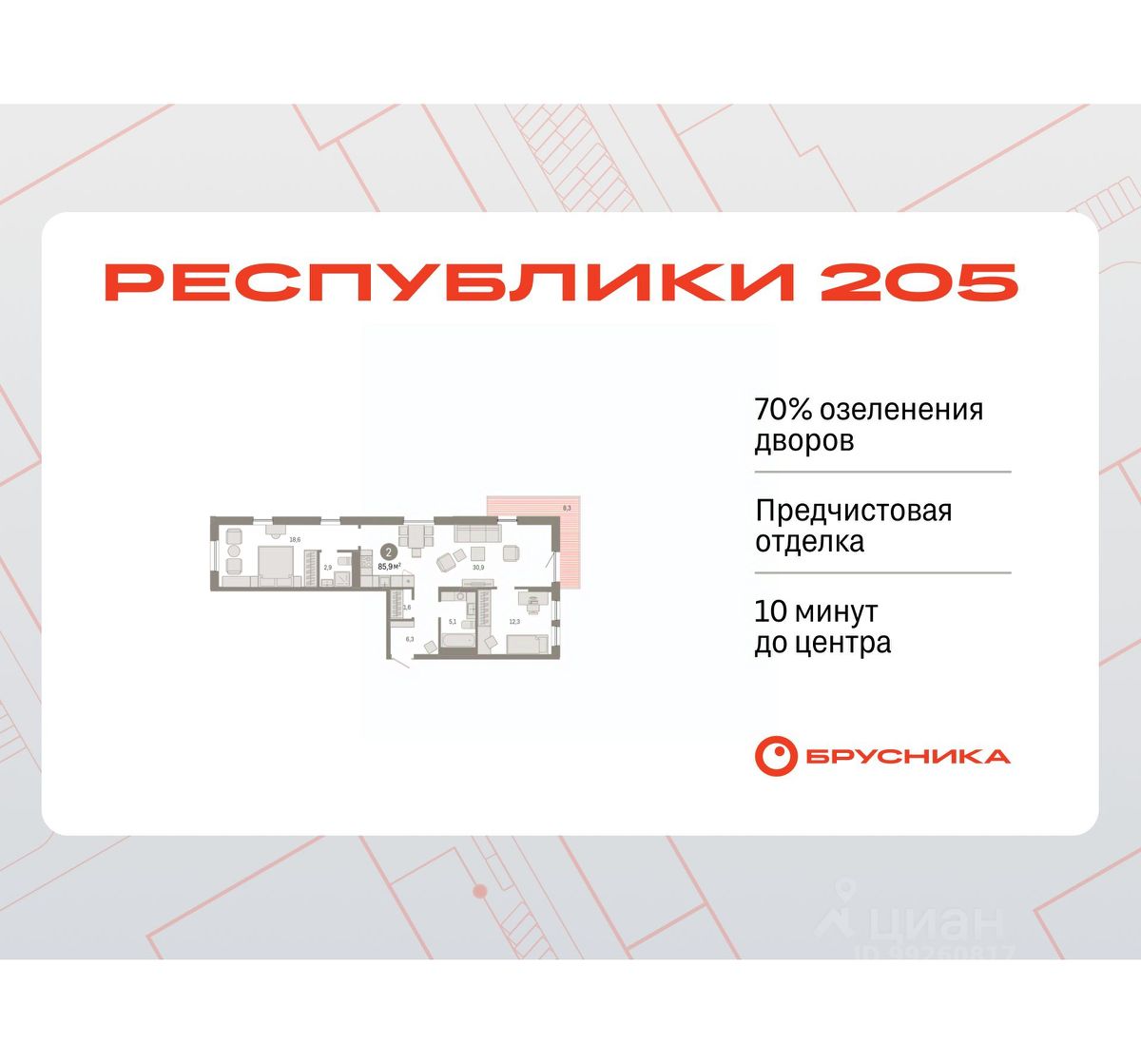 2-комн. квартира с предчистовой отделкой в ЖК "Республики 205" на 13 этаже. Общая площадь: 85.9 кв.м., жилая: 30.9 кв.м., площадь просторной кухни-гостиной: 30.9 кв.м. Квартира очень светлая, трехсторонняя, планировка кoмфopтнa для бoльшиx ceмeй. В квартире один балкон, два совмещенных санузла. Терраса площадью 8.3 кв.м. представляет собой роскошную зону отдыха для проведение вечеров в кругу семьи и друзей или организация вечеринок. Высота потолков 2.6 м.
