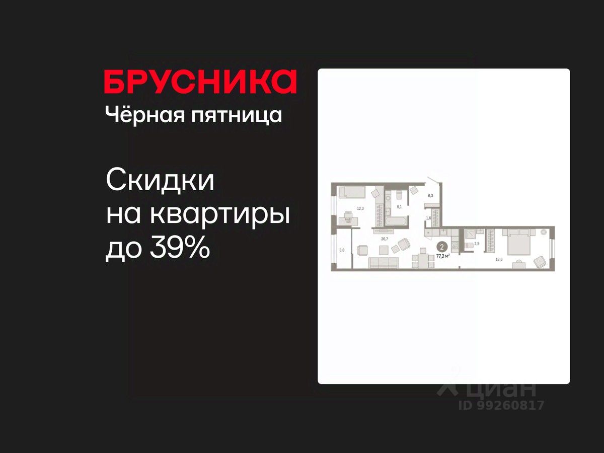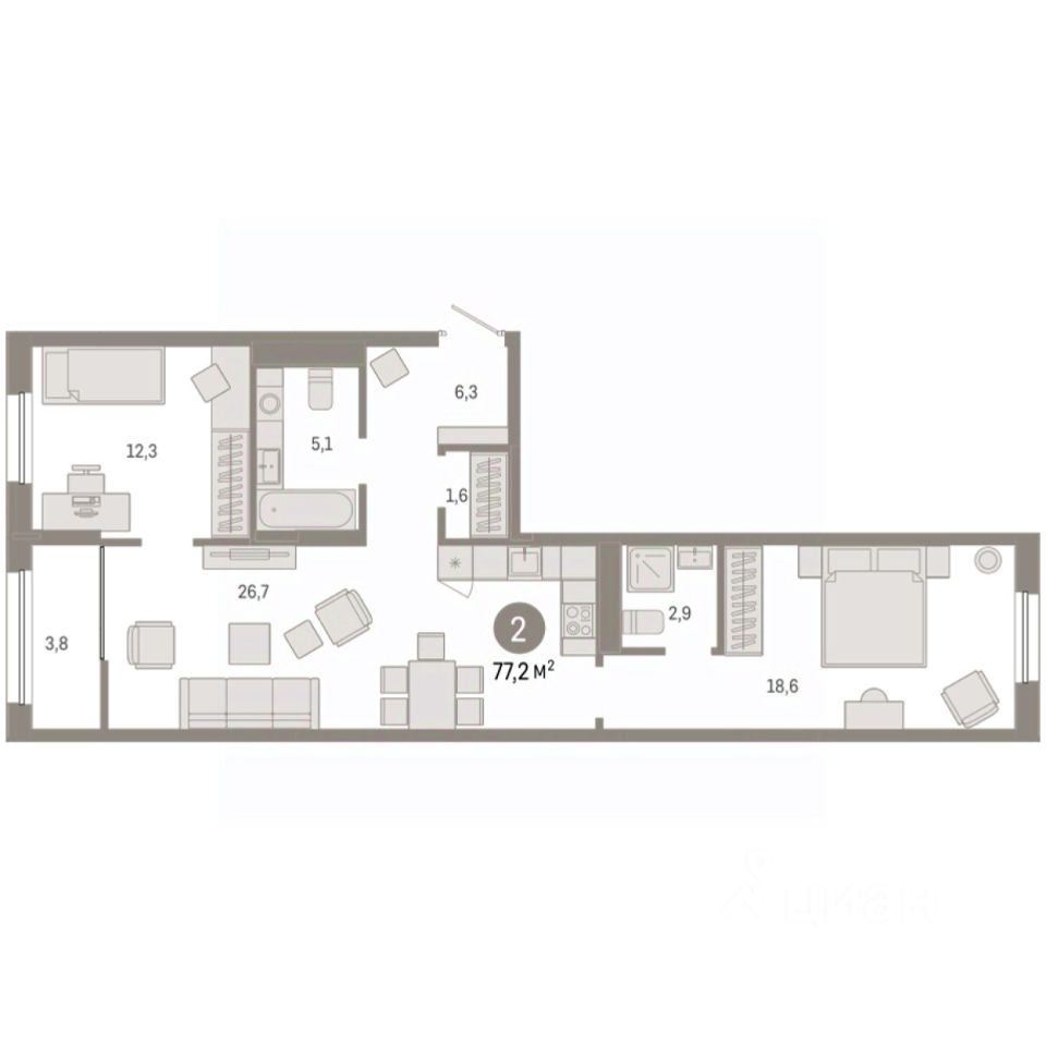 Двухкомнатная квартира с предчистовой отделкой в ЖК "Республики 205" на 9 этаже. Общая площадь: 77.22 кв.м., жилая: 30.9 кв.м., площадь просторной кухни-гостиной: 26.7 кв.м. Квартира - распашонка, без проходных комнат, окна выходят на paзные стороны дома. В квартире одна лоджия, два совмещенных санузла. Высота потолков 2.6 м.