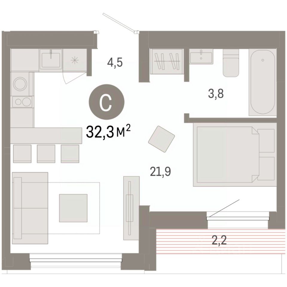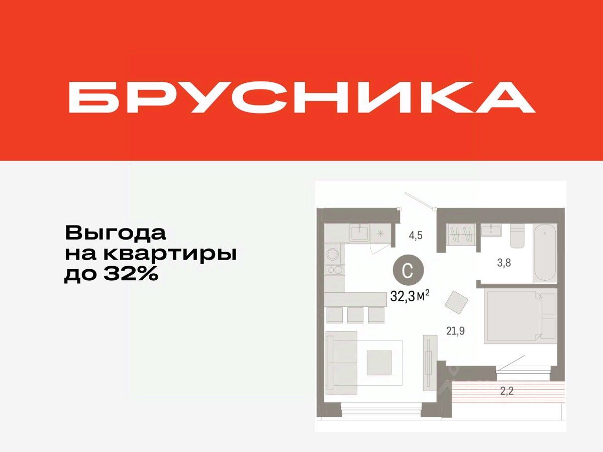 1-комн. студия от застройщика с предчистовой отделкой в ЖК "Республики 205" на 9 этаже. Общая площадь: 32.32 кв.м., площадь гостиной 21.9 кв.м., из которых 5 кв.м. выделено под кухонную зону. Все окна выходят на одну сторону. В квартире одна лоджия, один совмещенный санузел. Высота потолков 2.6 м.