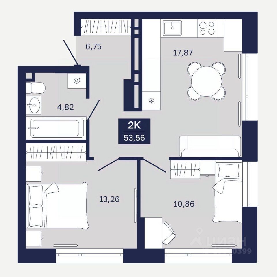 Общая площадь53,56 м²