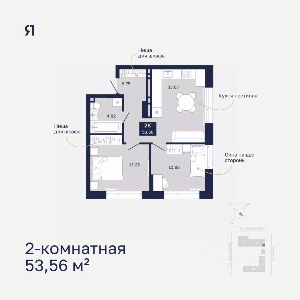 Продается 2-комн. квартира, 53,56 м²
