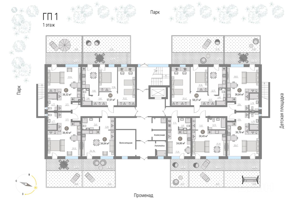 На первых этажах зданий расположены квартиры с террасами, на верхних этажах —