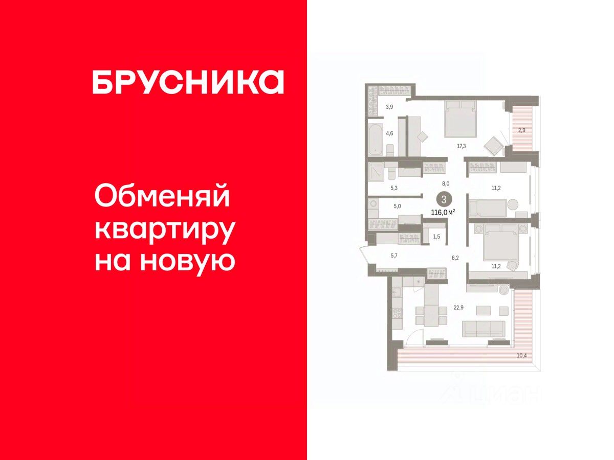 Квартира с кухней-гостиной и тремя спальнями в кварталах "На Минской". Особенности планировки: гардеробная, лоджия, мастер-спальня, панорамное остекление, постирочная, предчистовая отделка.