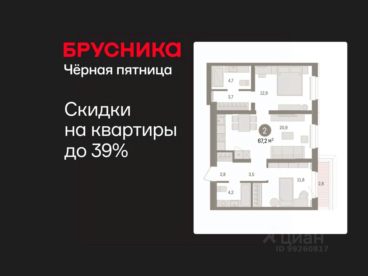 2-комн. квартира с предчистовой отделкой в Кварталы "На Минской" на 6 этаже. Общая площадь: 67.17 кв.м., жилая: 24.7 кв.м., площадь просторной кухни-гостиной: 20.9 кв.м. Комнаты изолированные, все окна выходят на одну сторону. В квартире один балкон, два совмещенных санузла. Высота потолков 2.7 м.