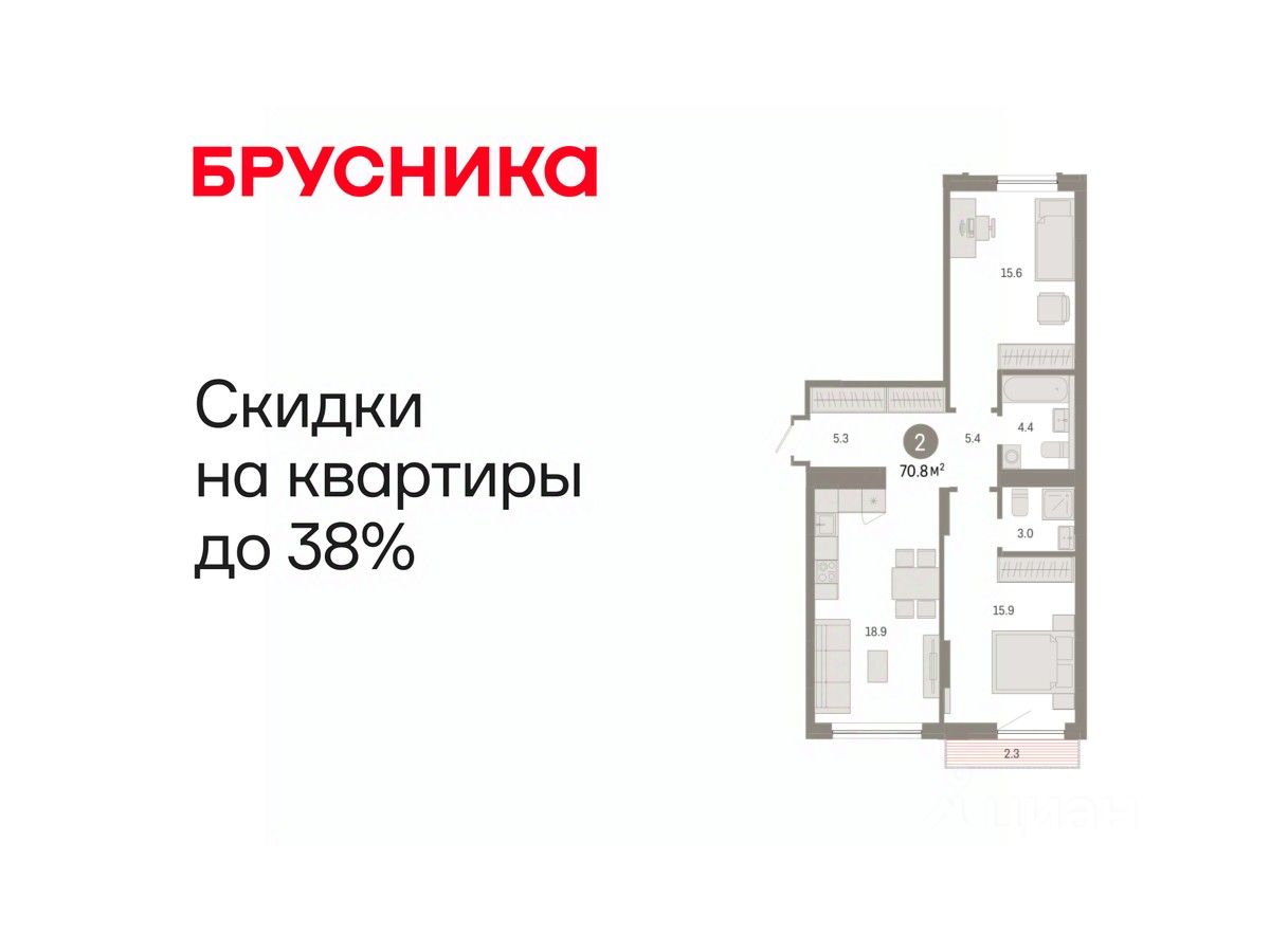 Квартира с кухней-гостиной и двумя спальнями в Октябрьском на Туре. Особенности планировки: балкон, вид во двор, второй санузел, гардеробная, мастер-спальня, предчистовая отделка, разнесённые спальни.
