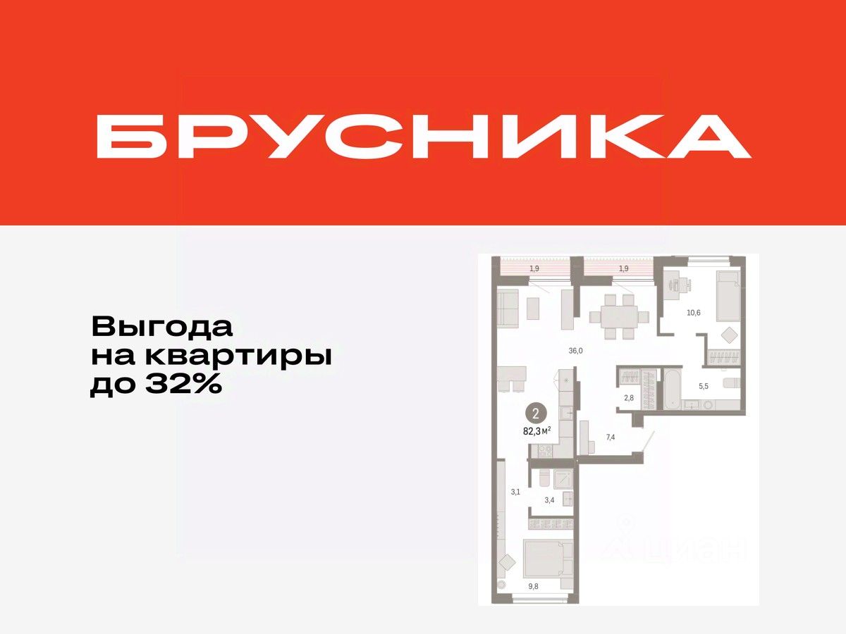 Квартира с кухней-гостиной и двумя спальнями в Октябрьском на Туре. Особенности планировки: вид во двор, лоджия, разнесённые спальни, предчистовая отделка, мастер-спальня.