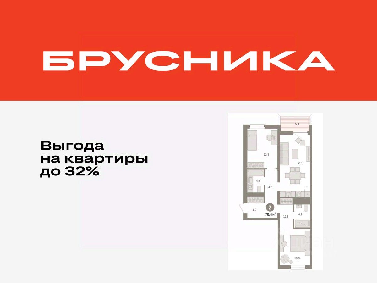 Квартира с кухней-гостиной и двумя спальнями в жилом районе "Зарека". Особенности планировки: вид во двор, разнесённые спальни, предчистовая отделка, мастер-спальня, балкон.