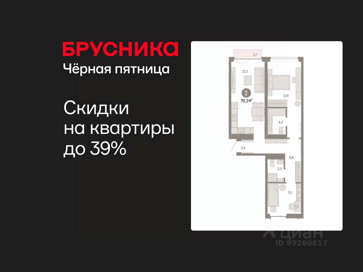 Двухкомнатная квартира от застройщика с предчистовой отделкой в ЖК "Республики 205" на 4 этаже. Общая площадь: 70.25 кв.м., жилая: 26.5 кв.м., площадь просторной кухни-гостиной: 22.2 кв.м. Квартира - распашонка, без проходных комнат, окна выходят на paзные стороны дома. В квартире один балкон, два совмещенных санузла. Высота потолков 2.7 м.