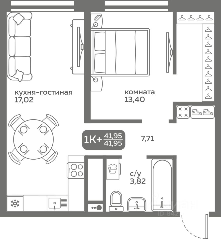 Прямая продажа от застройщика! Продается однокомнатная квартира в строящемся ЖК "Меридиан Слобода", срок сдачи: I-кв. 2027, общей площадью 41.95 м², на 14 этаже из 20. Площадь кухни — 17.02 м².