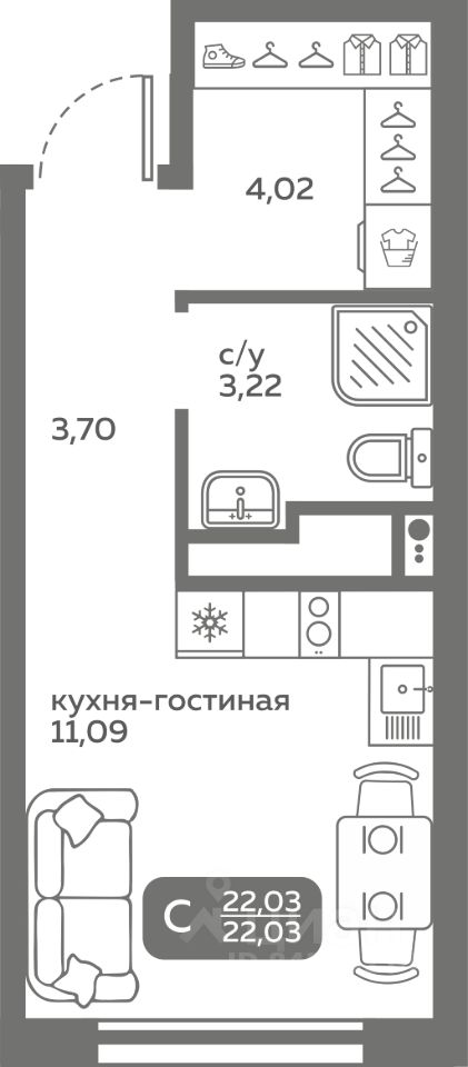 Прямая продажа от застройщика! Продается студия в строящемся ЖК "Меридиан Слобода", срок сдачи: I-кв. 2027, общей площадью 22.03 м², на 14 этаже из 20. Площадь кухни — 11.09 м².