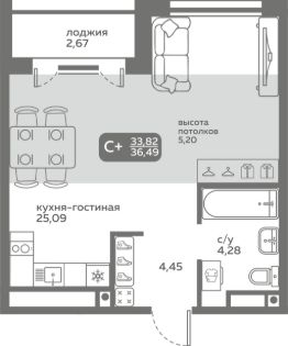 Прямая продажа от застройщика! Продается студия в строящемся ЖК "Меридиан Слобода", срок сдачи: I-кв. 2027, общей площадью 33.82 м², на 15 этаже из 20. Площадь кухни — 25.09 м².