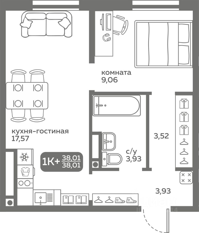 Прямая продажа от застройщика! Продается однокомнатная квартира в строящемся ЖК "Меридиан Слобода", срок сдачи: I-кв. 2027, общей площадью 38.01 м², на 7 этаже из 20. Площадь кухни — 17.57 м².