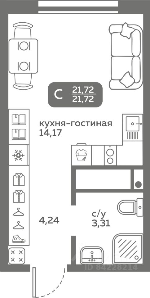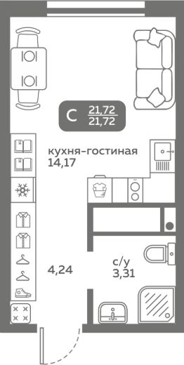 Прямая продажа от застройщика! Продается студия в строящемся ЖК "Меридиан Слобода", срок сдачи: I-кв. 2027, общей площадью 21.72 м², на 15 этаже из 20. Площадь кухни — 14.17 м².