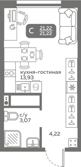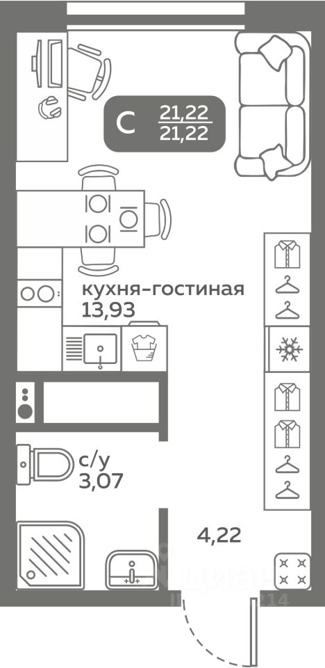 Прямая продажа от застройщика! Продается студия в строящемся ЖК "Меридиан Слобода", срок сдачи: I-кв. 2027, общей площадью 21.22 м², на 15 этаже из 20. Площадь кухни — 13.93 м².