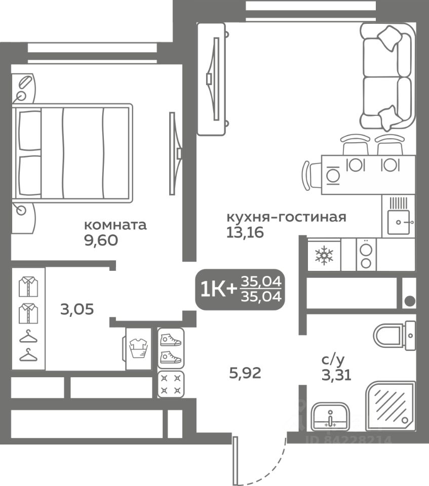 Прямая продажа от застройщика! Продается однокомнатная квартира в строящемся ЖК "Меридиан Слобода", срок сдачи: I-кв. 2027, общей площадью 35.04 м², на 19 этаже из 20. Площадь кухни — 13.16 м².