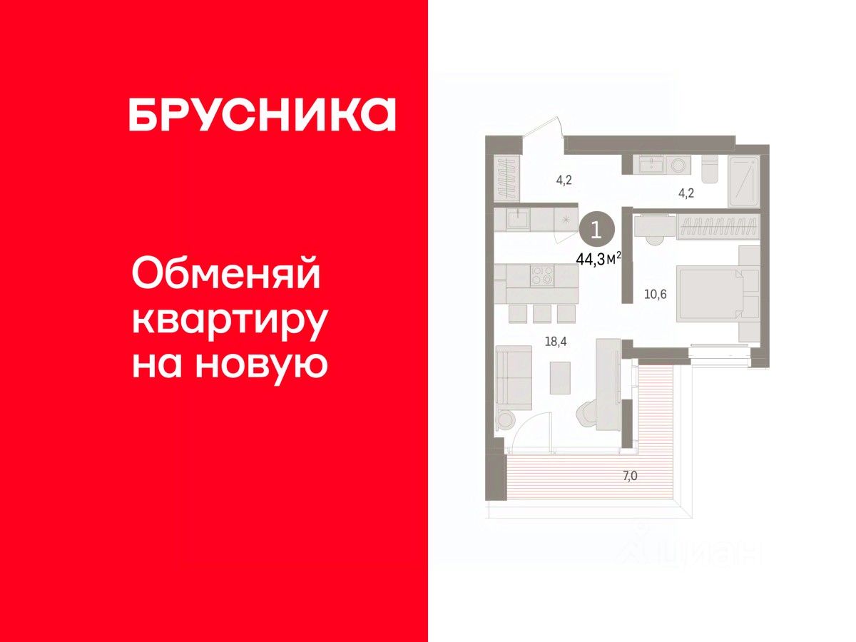 Квартира с кухней-гостиной и одной спальней в кварталах "На Минской". Особенности планировки: лоджия, панорамное остекление, предчистовая отделка.
