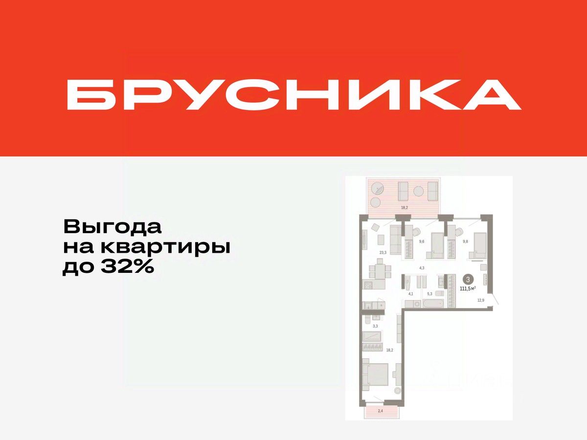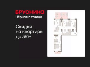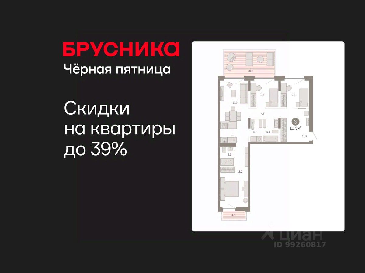 Квартира с кухней-гостиной и тремя спальнями в жилом районе "Зарека". Особенности планировки: без отделки, свободная планировка, разнесённые спальни, мастер-спальня, терраса, постирочная.