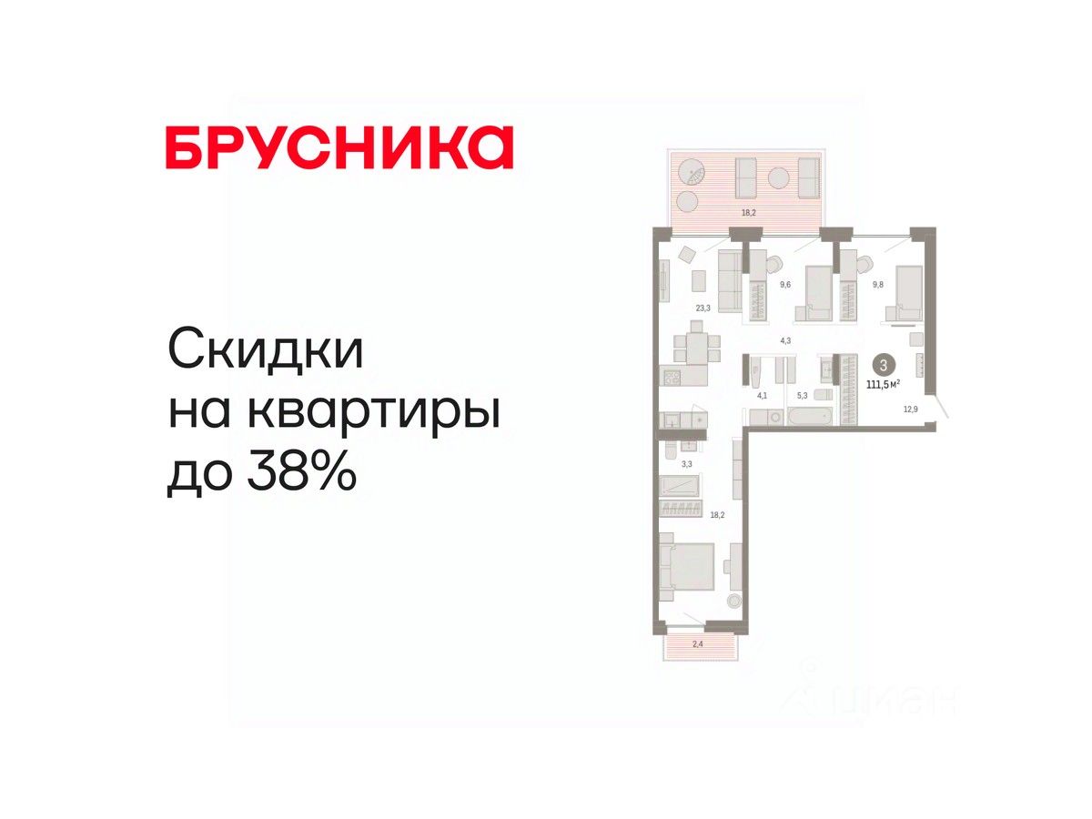 Квартира с кухней-гостиной и тремя спальнями в жилом районе "Зарека". Особенности планировки: мастер-спальня, постирочная, разнесённые спальни, свободная планировка, терраса.
