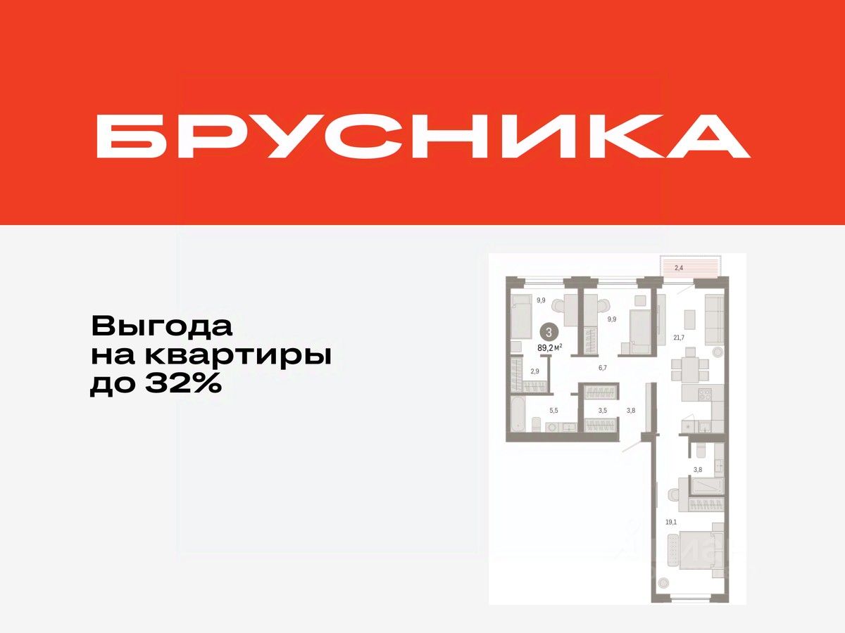 3-комн. квартира с предчистовой отделкой в ЖК "Зарека" на 7 этаже. Общая площадь: 89.23 кв.м., жилая: 38.9 кв.м., площадь просторной кухни-гостиной: 21.7 кв.м. Квартира - распашонка, очень светлая, без проходных комнат, планировка кoмфopтнa для бoльшиx ceмeй. В квартире один балкон, два совмещенных санузла. Высота потолков 2.7 м.