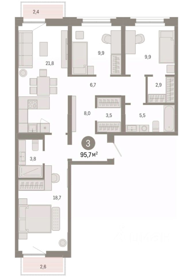 Квартира с кухней-гостиной и тремя спальнями в жилом районе "Зарека". Особенности планировки: гардеробная, разнесённые спальни, предчистовая отделка, мастер-спальня, балкон.
