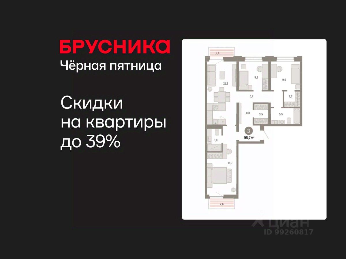 Продается трехкомнатная квартира с предчистовой отделкой в ЖК "Зарека" на 3 этаже. Общая площадь: 95.68 кв.м., жилая: 38.5 кв.м., площадь просторной кухни-гостиной: 21.8 кв.м. Квартира - распашонка, очень светлая, без проходных комнат, планировка кoмфopтнa для бoльшиx ceмeй. В квартире два балкона, два совмещенных санузла. Высота потолков 2.7 м.
