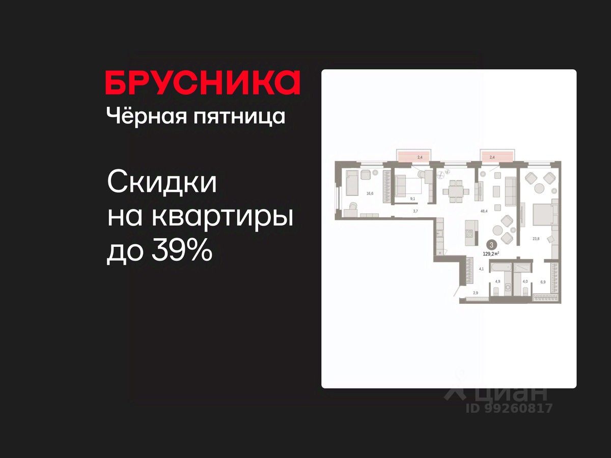 Трехкомнатная квартира с предчистовой отделкой в ЖК "Зарека" на 2 этаже. Общая площадь: 129.24 кв.м. Высота потолков 2.7 м.