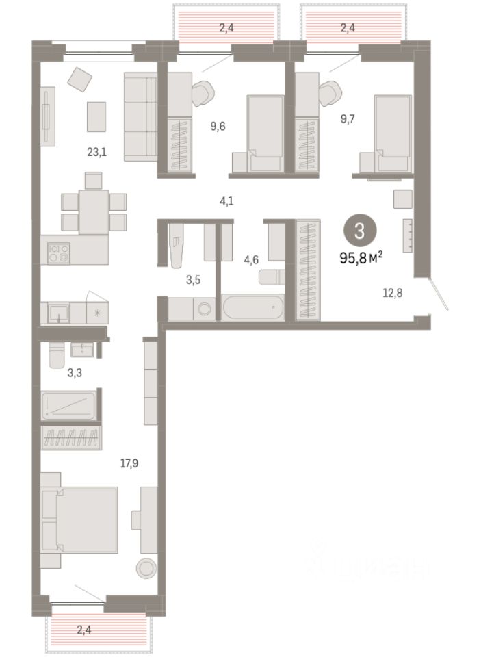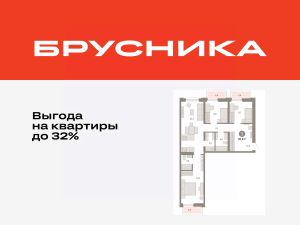 Квартира с кухней-гостиной и тремя спальнями в жилом районе "Зарека". Особенности планировки: разнесённые спальни, предчистовая отделка, мастер-спальня, постирочная, балкон.