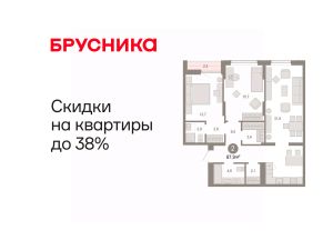 Квартира с кухней-гостиной и двумя спальнями в Октябрьском на Туре. Особенности планировки: гардеробная, лоджия, мастер-спальня, предчистовая отделка.
