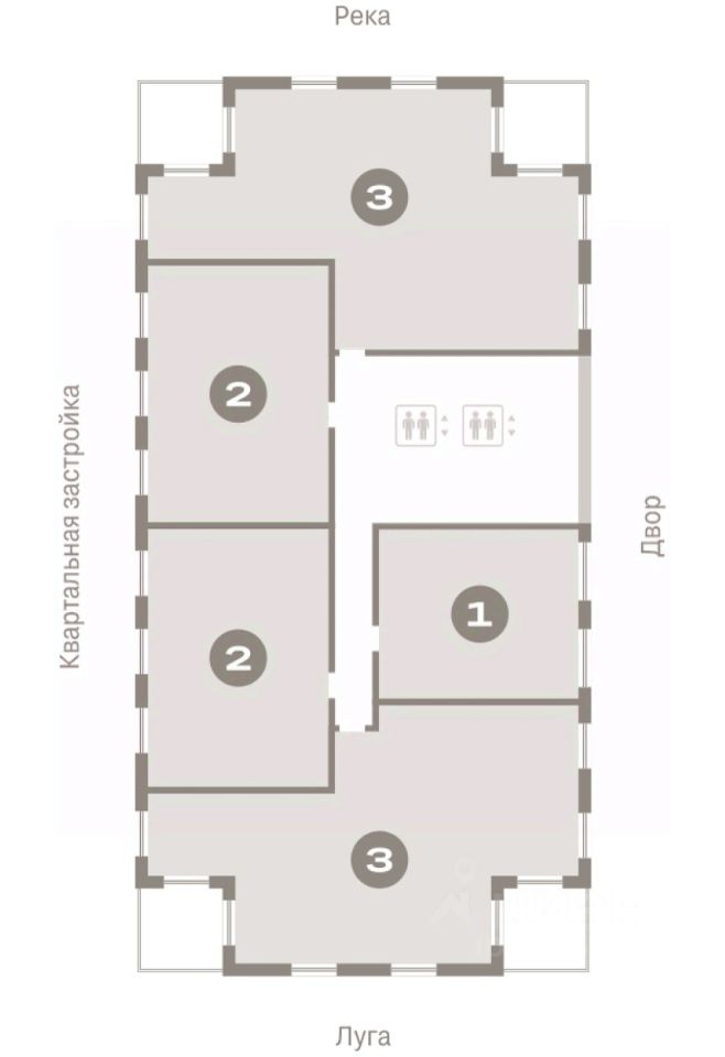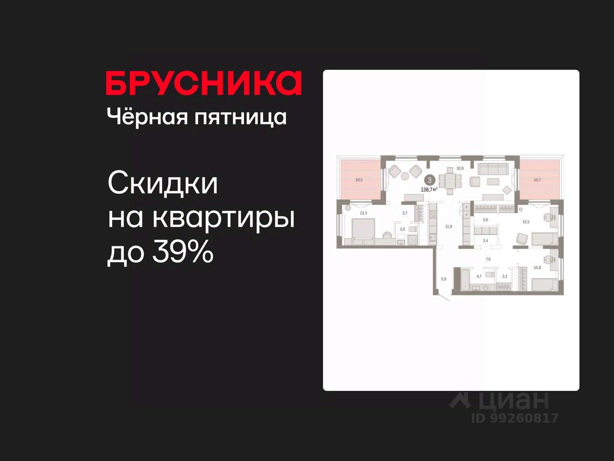 Квартира с кухней-гостиной и тремя спальнями в Октябрьском на Туре. Особенности планировки: гардеробная, без отделки, вид на реку, вид во двор, свободная планировка, разнесённые спальни, мастер-спальня, терраса на крыше.
