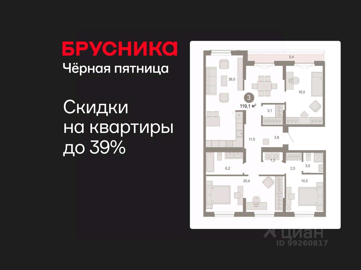 Квартира с кухней-гостиной и тремя спальнями в Октябрьском на Туре. Особенности планировки: гардеробная, вид во двор, разнесённые спальни, предчистовая отделка, мастер-спальня, постирочная, терраса на крыше.