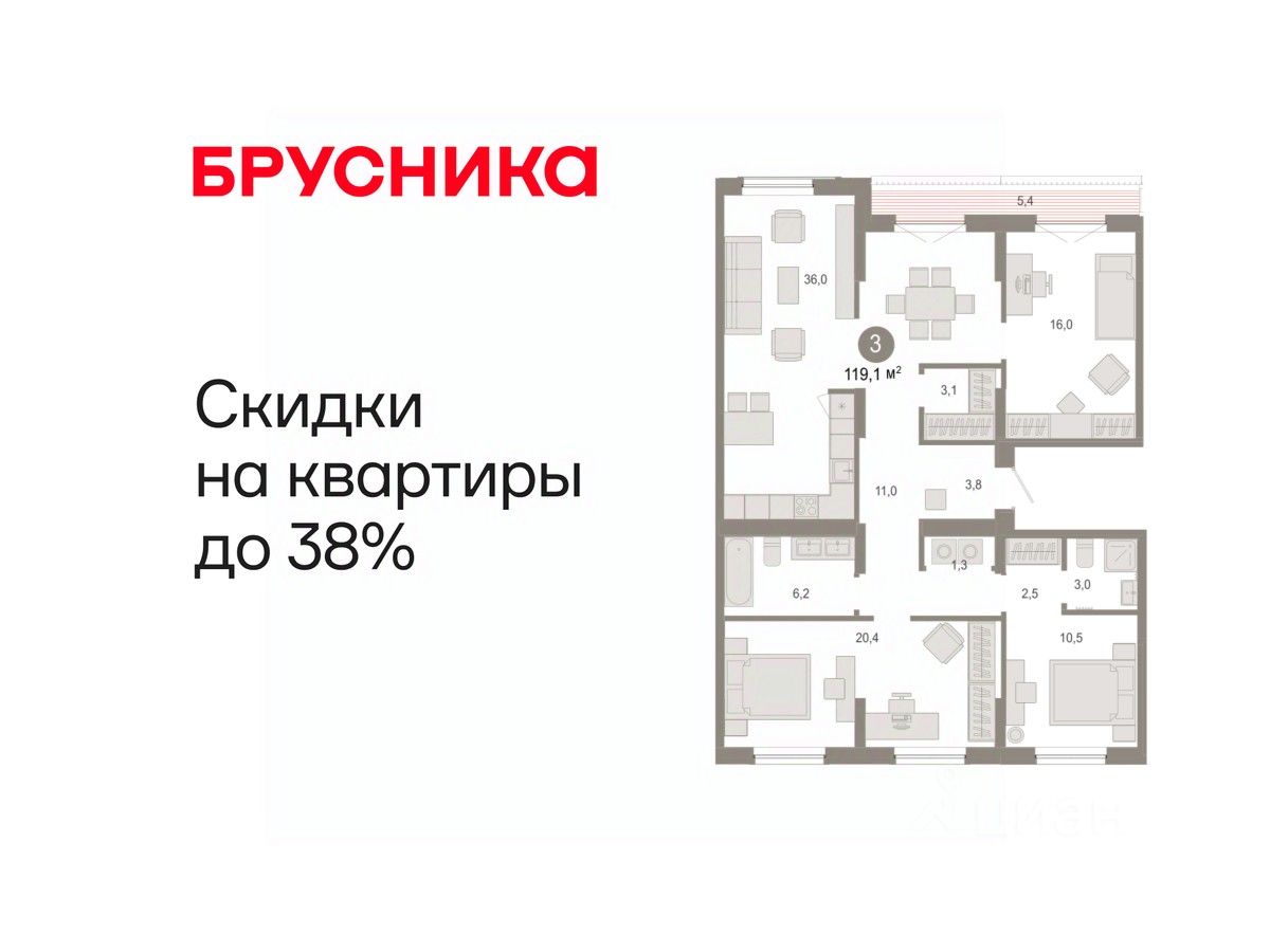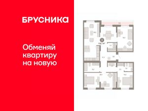 Квартира с кухней-гостиной и тремя спальнями в Октябрьском на Туре. Особенности планировки: вид во двор, гардеробная, мастер-спальня, постирочная, предчистовая отделка, разнесённые спальни, терраса на крыше.