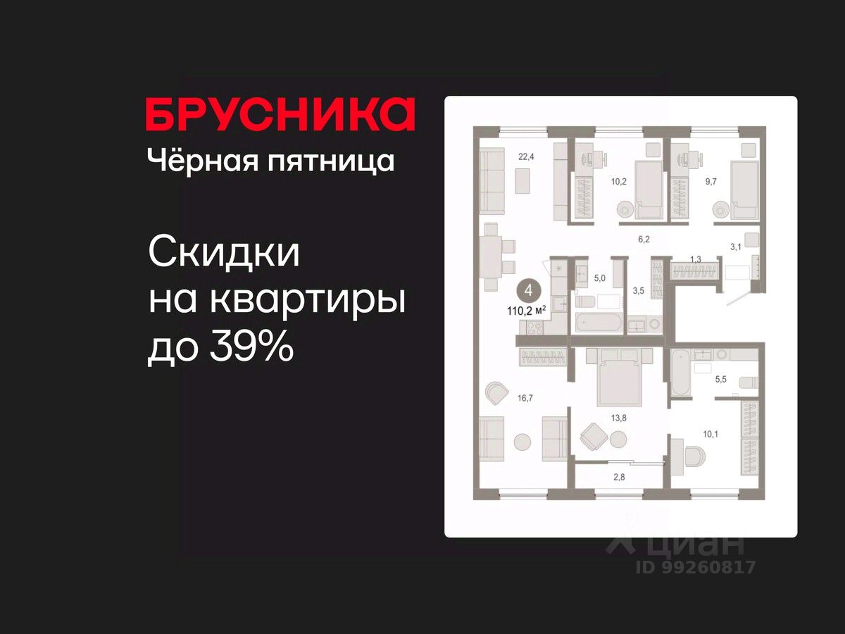 Квартира с кухней-гостиной и четырьмя спальнями в Октябрьском на Туре. Особенности планировки: второй санузел, гардеробная, рабочий кабинет, вид во двор, тёплая лоджия, предчистовая отделка, постирочная.