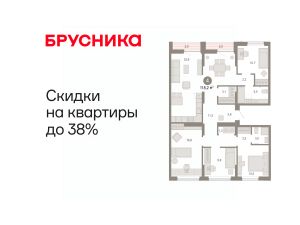 Квартира с кухней-гостиной и четырьмя спальнями в Октябрьском на Туре. Особенности планировки: вид во двор, гардеробная, лоджия, мастер-спальня, постирочная, предчистовая отделка, разнесённые спальни.