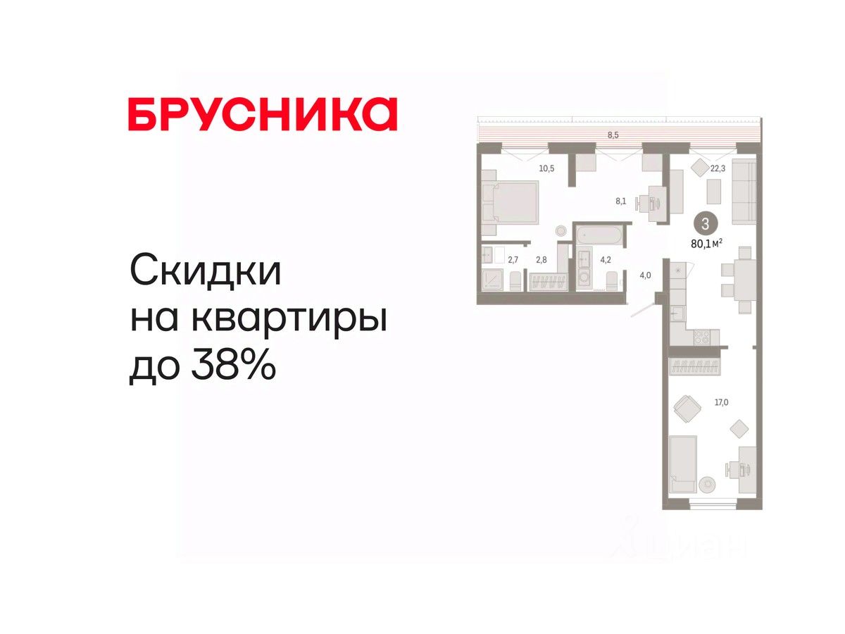 Квартира с кухней-гостиной и тремя спальнями в Октябрьском на Туре. Особенности планировки: вид во двор, гардеробная, мастер-спальня, предчистовая отделка, рабочий кабинет, разнесённые спальни, терраса на крыше.