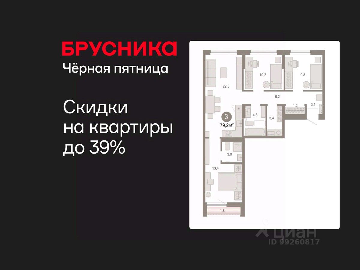 Квартира с кухней-гостиной и тремя спальнями в Октябрьском на Туре. Особенности планировки: гардеробная, вид во двор, лоджия, разнесённые спальни, предчистовая отделка, мастер-спальня, постирочная.