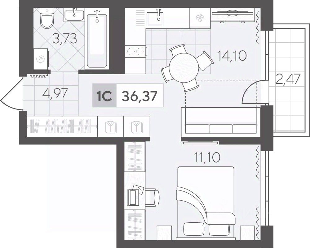 Однокомнатная квартира 36.37 кв.м на 2 этаже с продуманной планировкой. Просторная кухня-гостиная идеально подходит для приёма гостей, а уютная спальня станет личным местом отдыха.