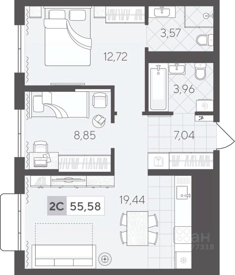 Двухкомнатная квартира 55.58 кв.м на 9 этаже — это удобное пространство для комфортной жизни. Отдельные спальни позволят каждому члену семьи иметь личное пространство. В кухне-гостиной комфортно вместе готовить, проводить семейные ужины или настольные игры с друзьями.