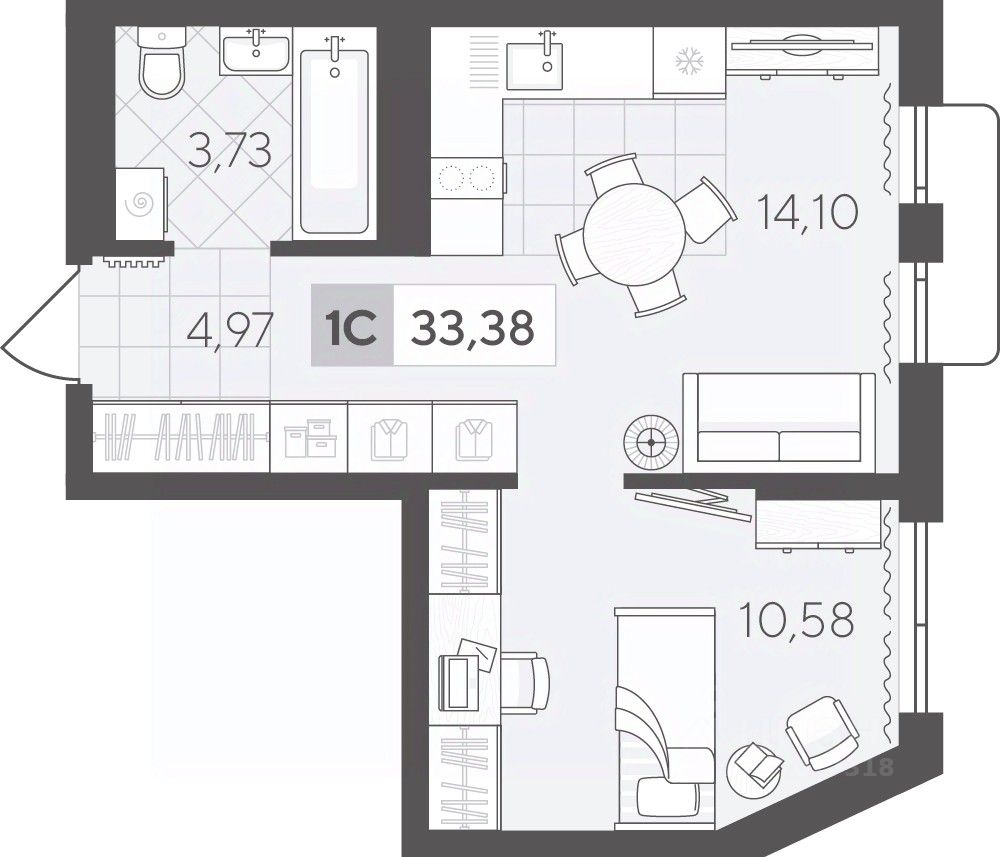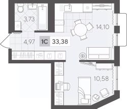 Однокомнатная квартира 33.38 кв.м на 9 этаже с продуманной планировкой. Просторная кухня-гостиная идеально подходит для приёма гостей, а уютная спальня станет личным местом отдыха.