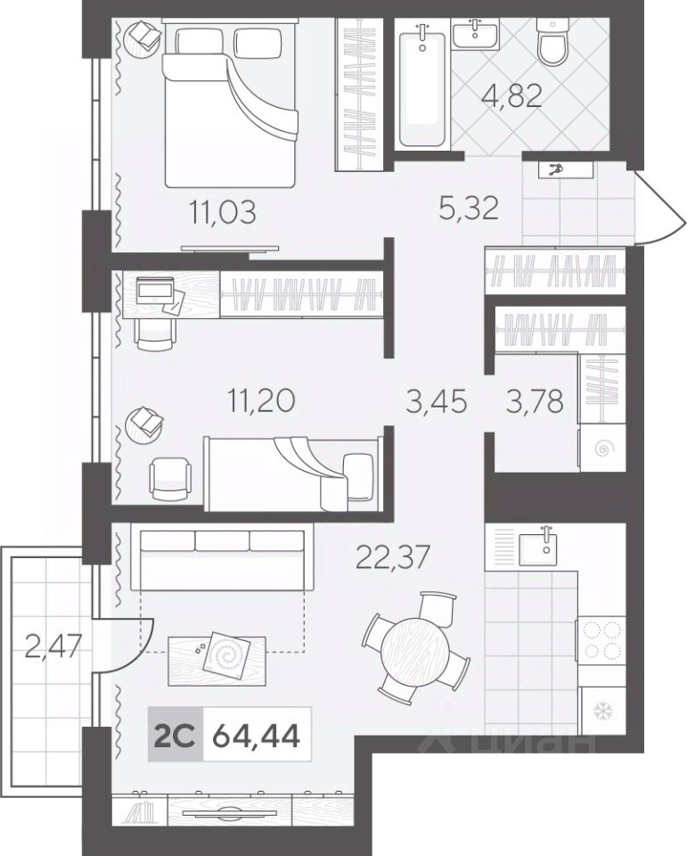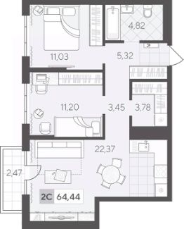 Квартира с двумя спальнями площадью 64.44 кв.м на 2 этаже. Продуманная геометрия комнат позволит легко зонировать пространство для личного досуга и места, где удобно проводить время с семьей или встречать гостей.