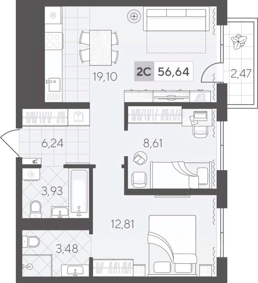 Двухкомнатная квартира 56.64 кв.м на 2 этаже — идеальный вариант для молодой семьи или пары. Просторная кухня-гостиная станет местом семейных встреч, а две спальни обеспечат удобство и приватность для каждого.