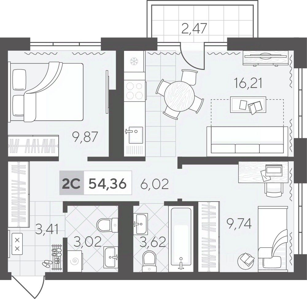 Квартира с двумя спальнями площадью 54.36 кв.м на 10 этаже. Продуманная геометрия комнат позволит легко зонировать пространство для личного досуга и места, где удобно проводить время с семьей или встречать гостей.