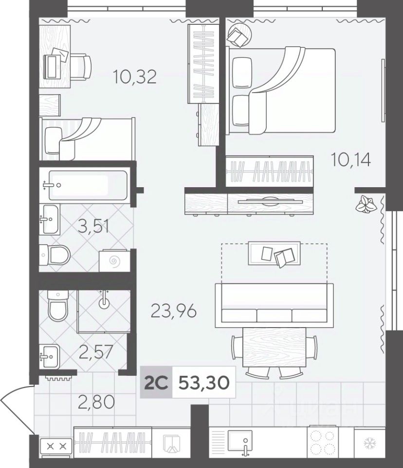 Квартира с двумя спальнями площадью 53.3 кв.м на 3 этаже. Продуманная геометрия комнат позволит легко зонировать пространство для личного досуга и места, где удобно проводить время с семьей или встречать гостей.