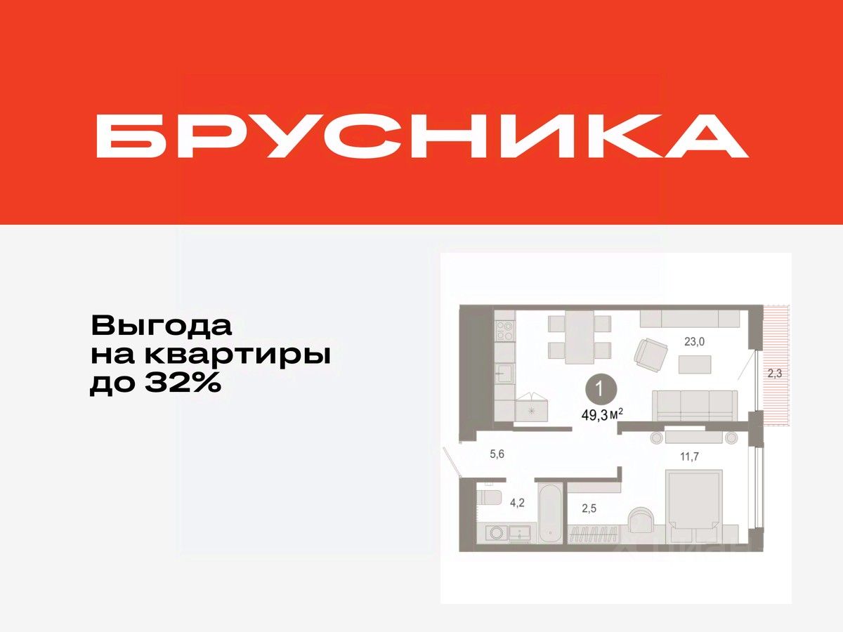 Квартира с кухней-гостиной и одной спальней в Октябрьском на Туре. Особенности планировки: гардеробная, вид во двор, предчистовая отделка, балкон.