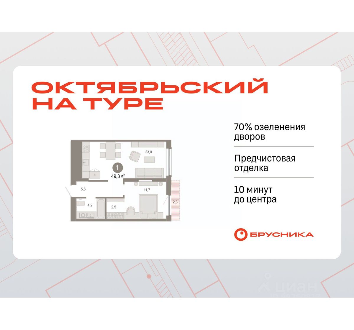 Квартира с кухней-гостиной и одной спальней в Октябрьском на Туре. Особенности планировки: гардеробная, вид во двор, предчистовая отделка, балкон, терраса на крыше.