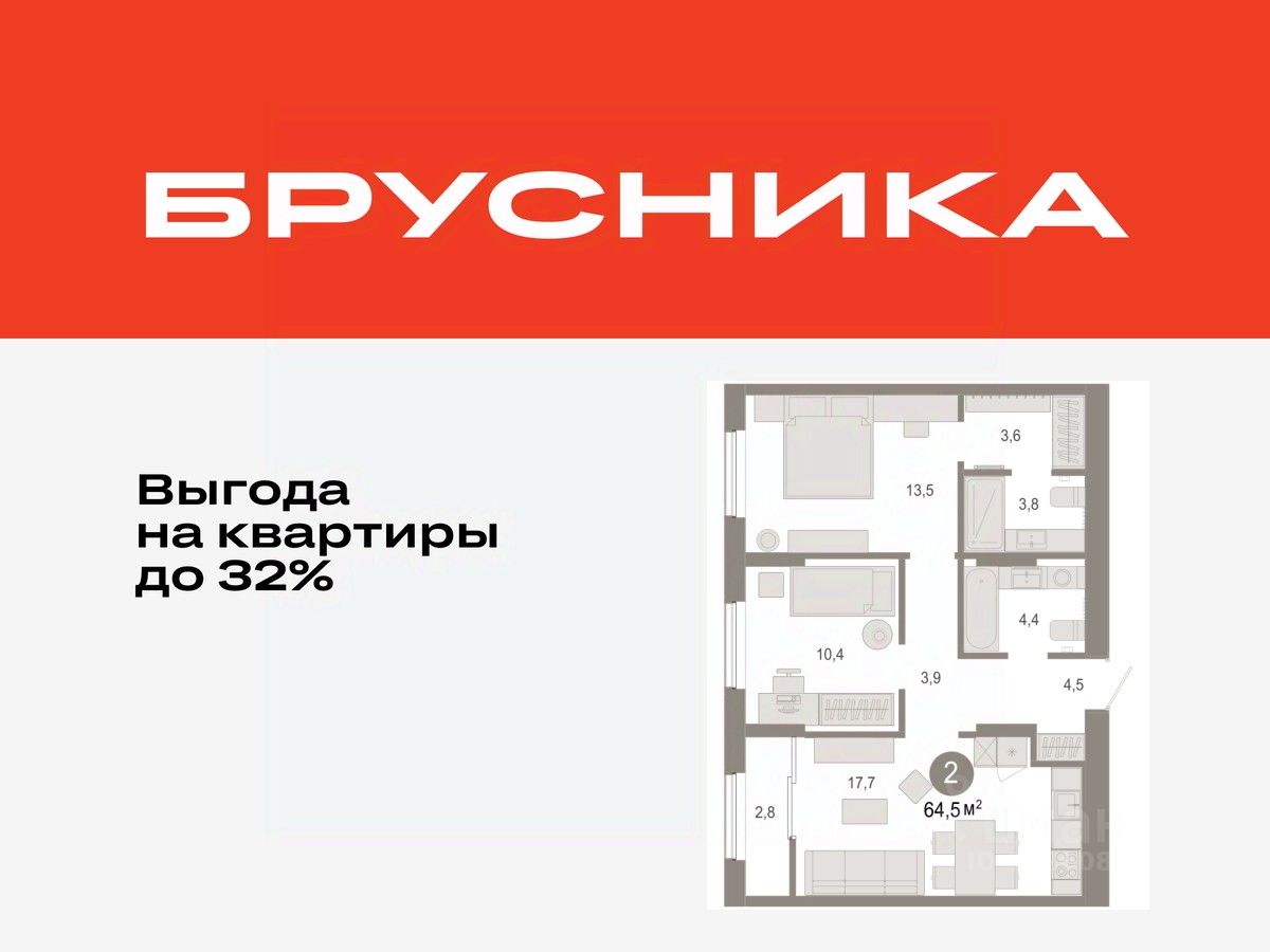 Квартира с кухней-гостиной и двумя спальнями в Октябрьском на Туре. Особенности планировки: гардеробная, тёплая лоджия, предчистовая отделка, мастер-спальня.